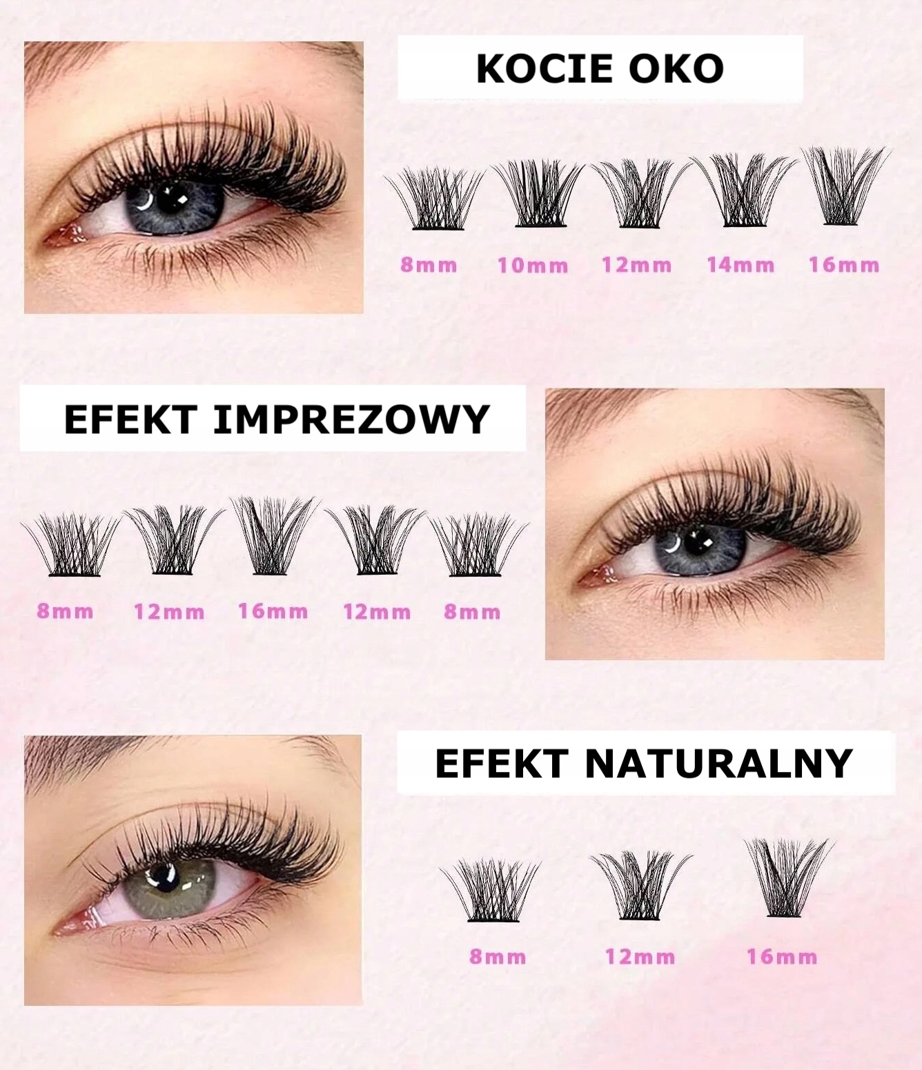 - Naturalny wygląd: Kępki są lekkie i komfortowe, dzięki czemu wyglądają jak naturalne rzęsy.